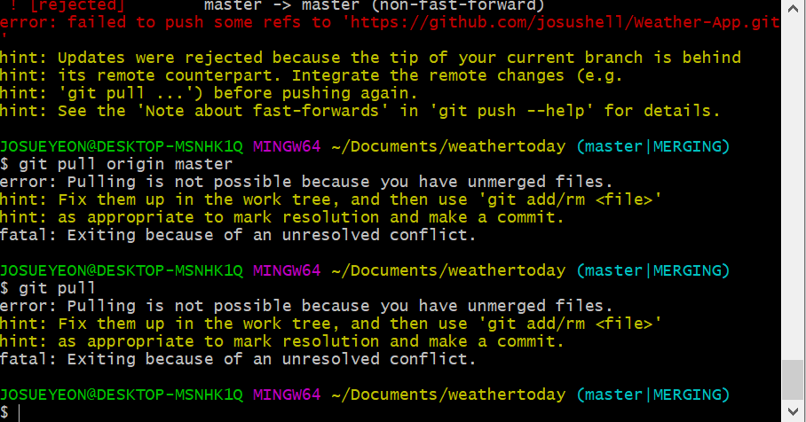 -> local이랑 원격에 있는 동일 파일이 local에서는 merge가 안되었기 때문