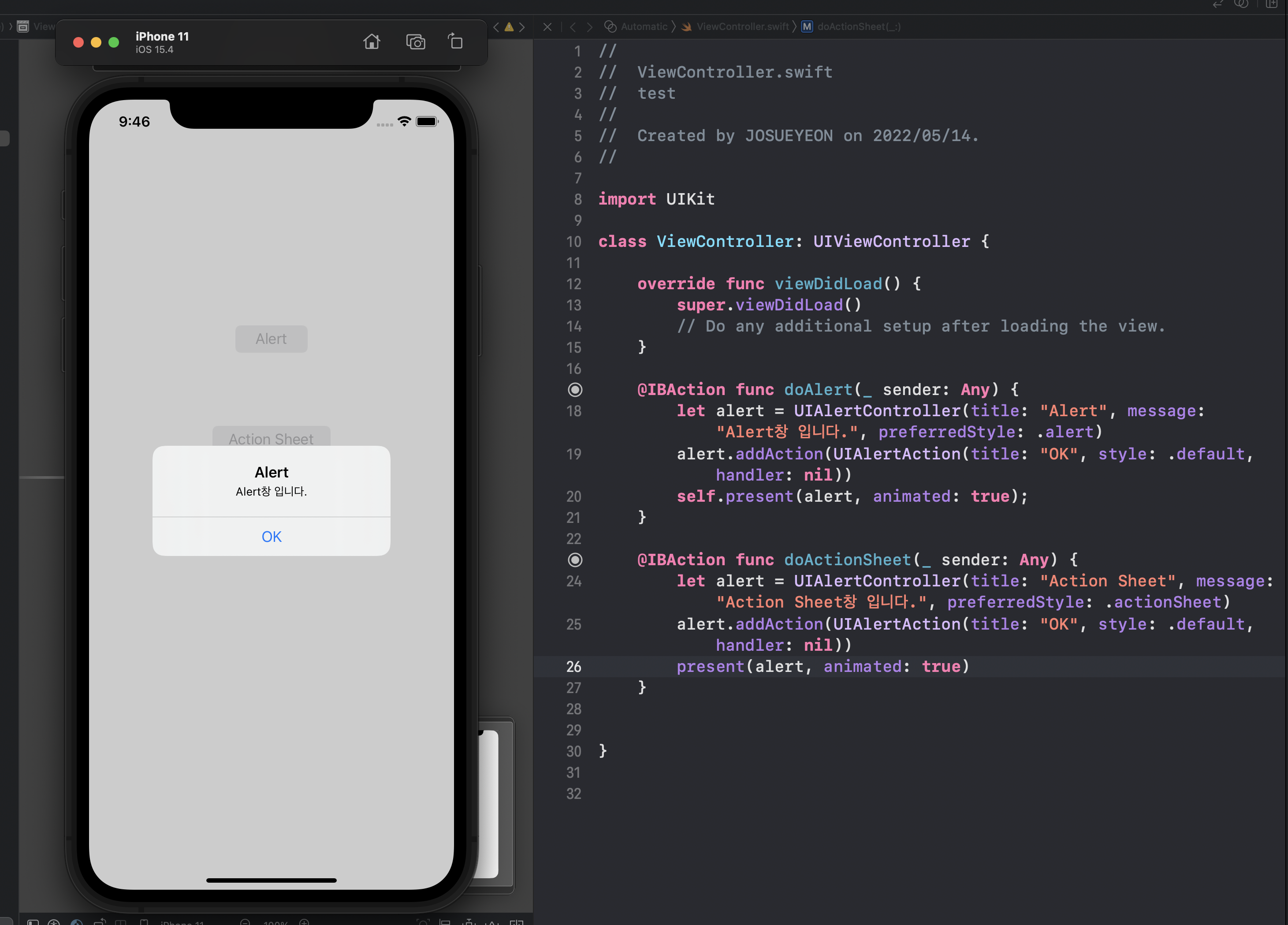 UIKit에서 알림창을 띄우는 객체는 UIAlertController이다. 경고창과 액션 시트 두 가지를 모두 구현 가능하며 다음과 같이 구현할 수 있다.