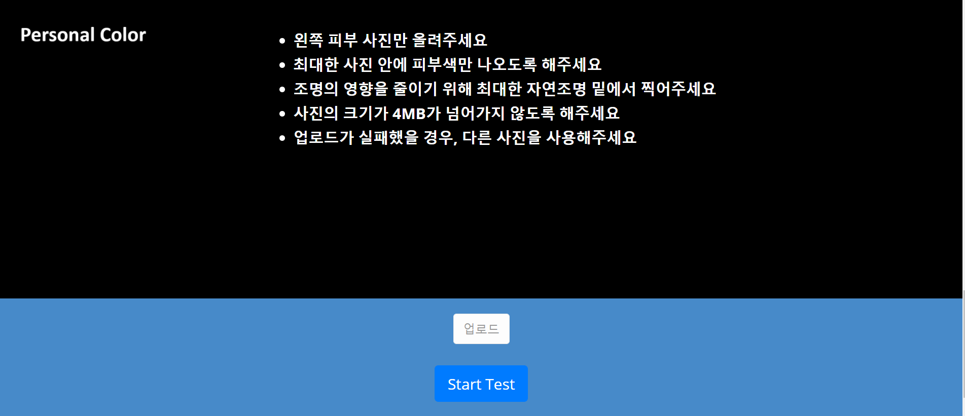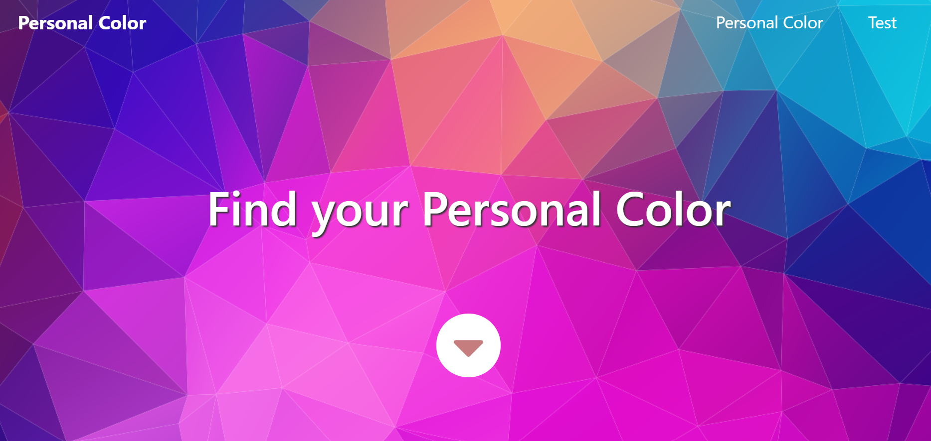 학기 중에 친구와 웹 프로젝트를 하기로 했음. 사람들이 다들 집에서 심리테스트, 색깔 테스트 이런 테스트들만 주구장창 하길래 (오죽하면 테스트들이 실검에 종일 떠 있을 정도) 우리도 트렌드를 따르기로 했음. 일단 맨 처음에 계획한 것은 퍼스널 컬러를 검사하고 그에 맞는 스타일을 추천해주는 서비스였는데 시간이 없어서 검사만 구현했다.