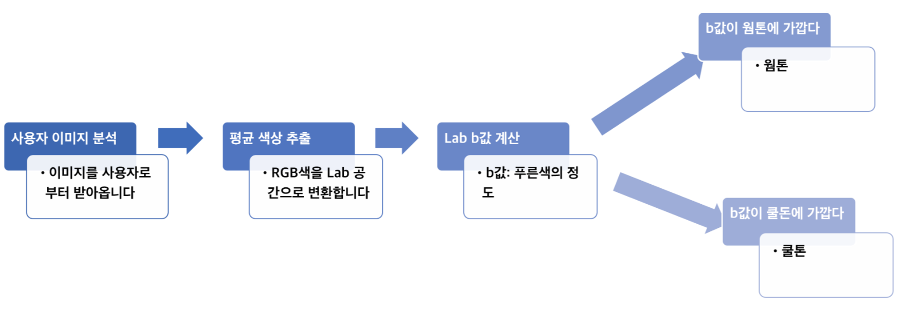 기존 알고리즘은 봄, 가을 웜/ 여름, 겨울 쿨 부분으로 컬러감 뿐만 아니라 계절도 구분한 상태였는데, 계절까지는 필요 없기도 하고 정확성에 올인하자는 마음으로 컬러감만 구분하는 것으로 약간 수정했다.