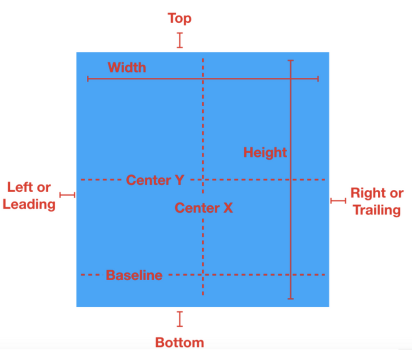 이를 바탕으로 위쪽에 제약을 걸고 싶다면 Top을, 왼쪽에 제약을 걸고 싶다면 Left 또는 Leading을 설정해주는 방식으로 제약사항을 설정 해야 한다.
