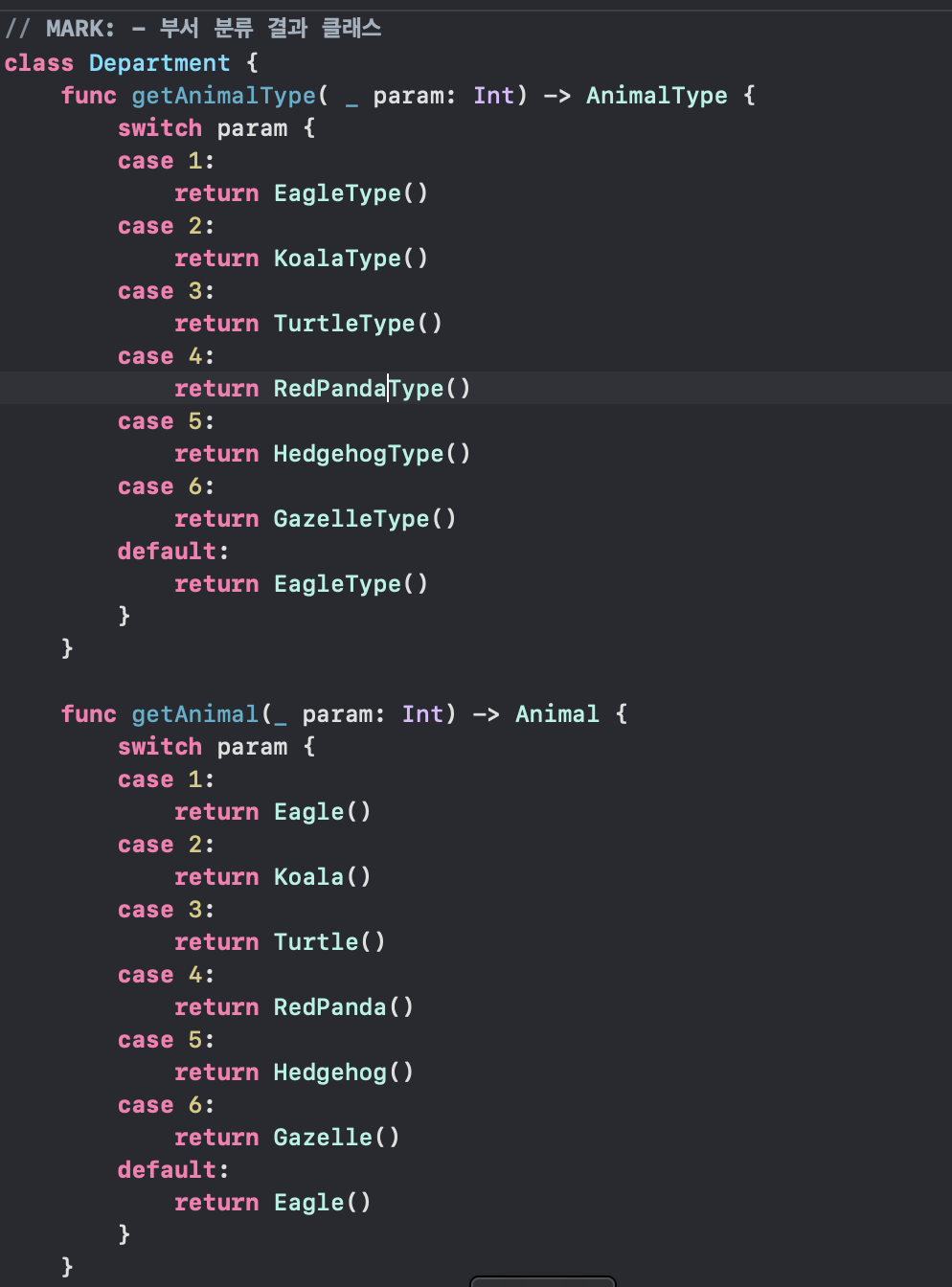 그 다음 머신 러닝을 통해 나온 classification을 바탕으로 부서 class를 return 하면 AnimalType에 넣어주는 형태로 설계했다. 정말.. 객체 지향은 최고다. 사실 클래스, 상속, 객체 지향 등을 배울 때는 잘 못느끼는데 직접 프로젝트를 하다보면 정말 아름다운 아키텍쳐같다.