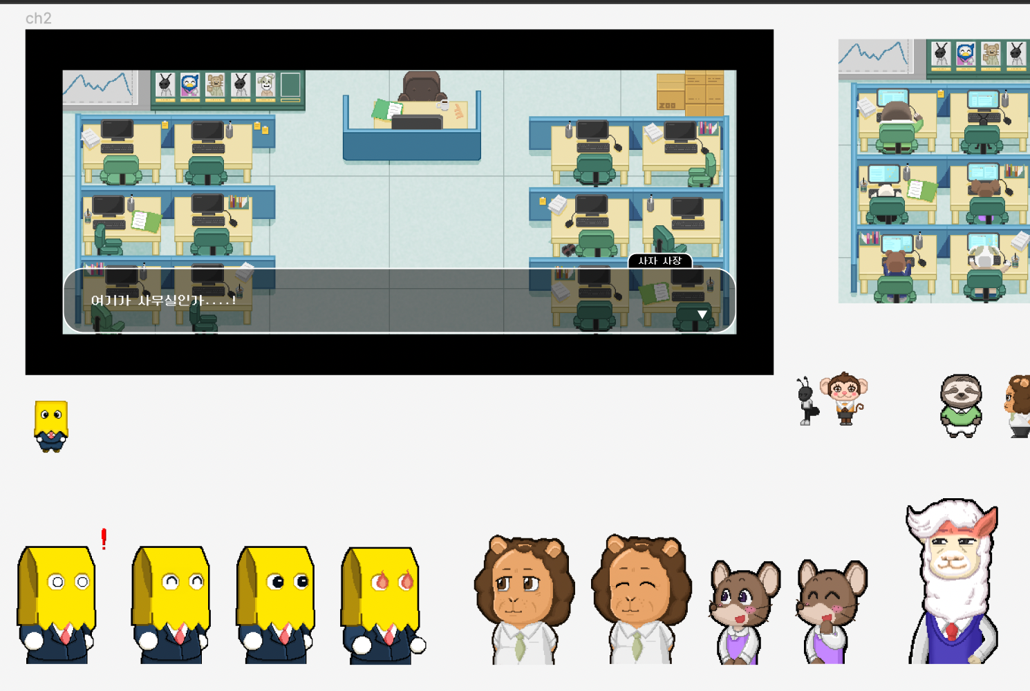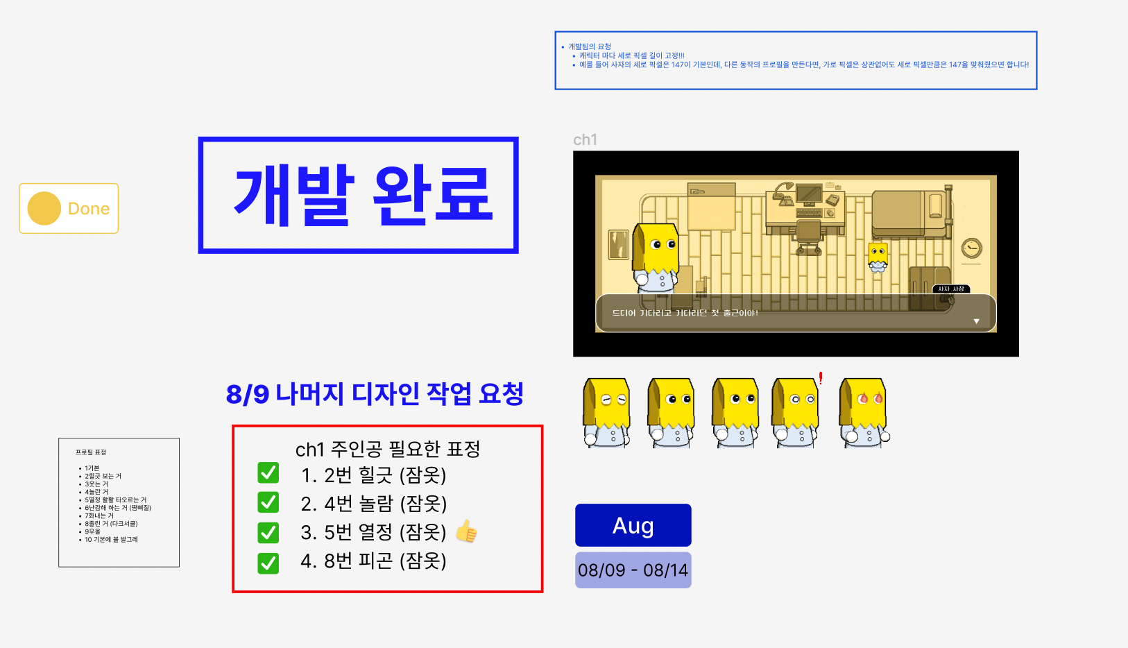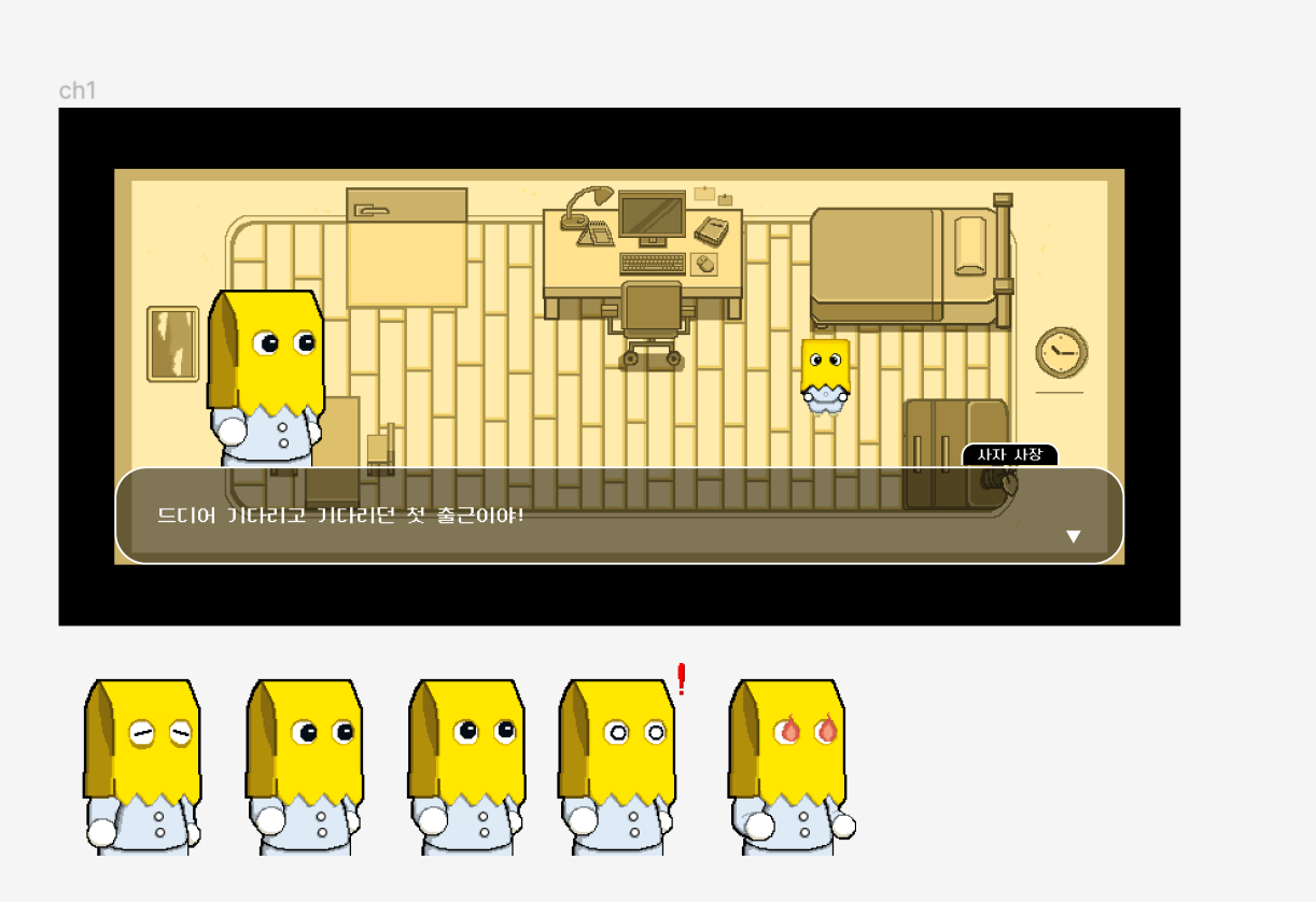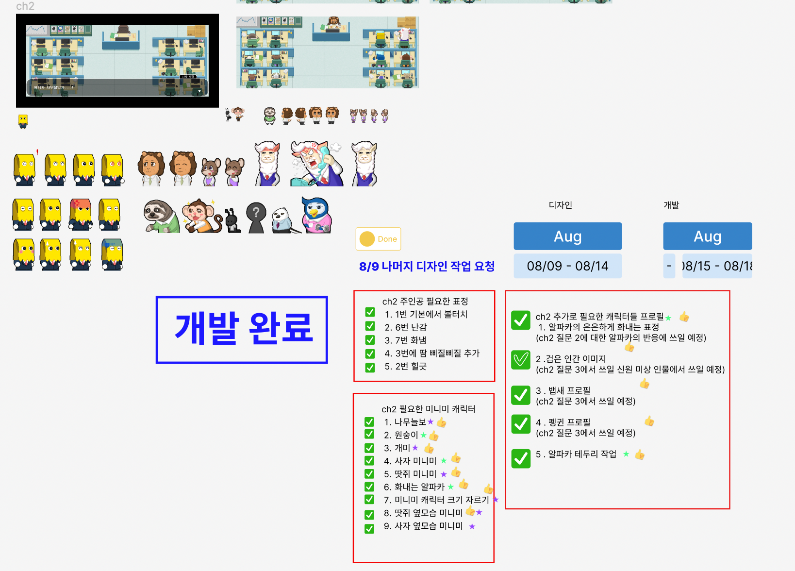 게임 디자인은 가장 오랜 시간이 걸렸던 파트였다. 게임 챕터마다 필요한 디자인 요소가 너무 많아서 작업에 오랜 시간이 걸렸다. 결국 모든 디자인을 끝낼 때까지 기다릴 수가 없어서 개발과 디자인을 병렬로 진행했다. 결국 마지막쯤 가서는 작업 리스트가 너무 많아져서 디자인 팀원을 두분정도 더 모셔왔다.