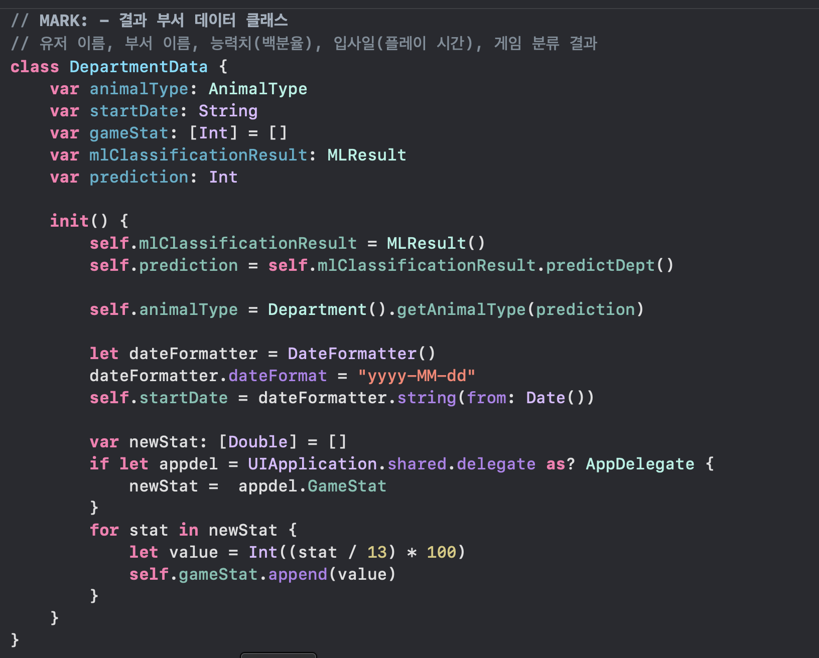 이걸 바탕으로 유저 선택지를 파라미터로 predict를 하고, classification 결과를 label로 return 한 것을 가지고 Department class에 넣어서 유저의 동물과 부서 클래스를 생성했다.
