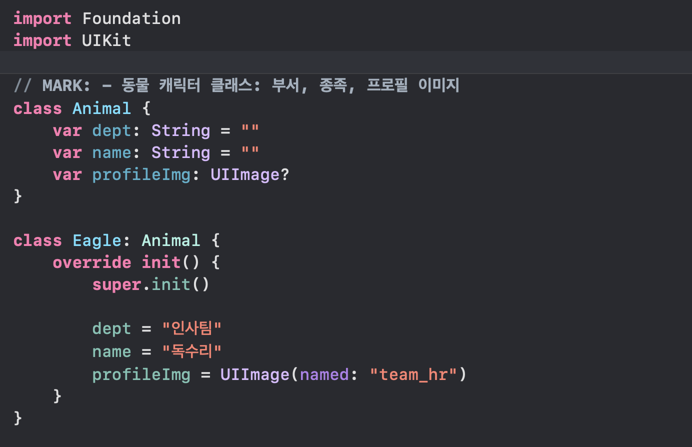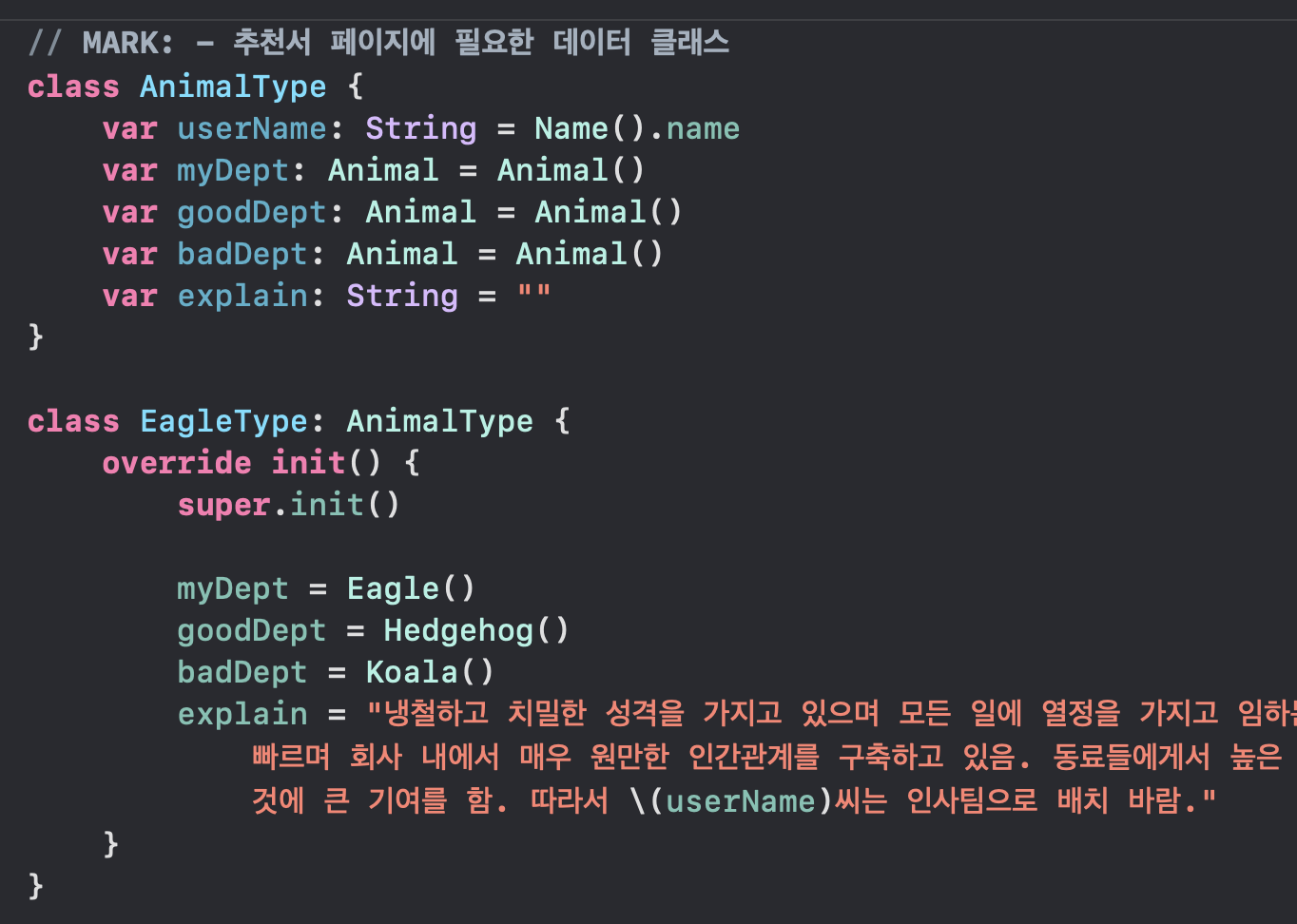 전체적으로 동물이 가져야 하는 정보는 Animal class를 상속받아 만들었다. 그리고 이러한 Animal class 여러개가 필요한 동물 타입 클래스를 상속받을 수 있도록 하였다. 이렇게 만든 AnimalType 클래스는 결과 viewcontroller가 필요한 데이터를 바인딩하는 클래스에 생성되어 들어간다.