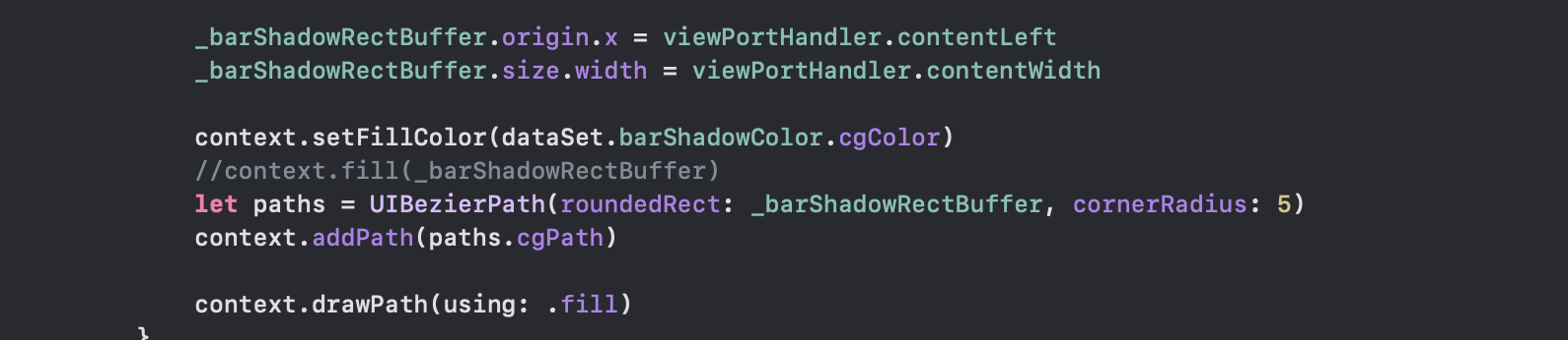 원하는 곡선 모양을 추가하기 위해서 인턴을 하며 배웠던 UIBezierPath를 사용했다. UIBezierPath(roundedRect:) 를 사용하여 곡선 처리 된 사각형을 context에 추가하는 방향으로 그렸다. 그런데 왜 어느 부분은 잘 되고 어느 부분은 잘 안되는지 아직도 원인은 못찾았다.