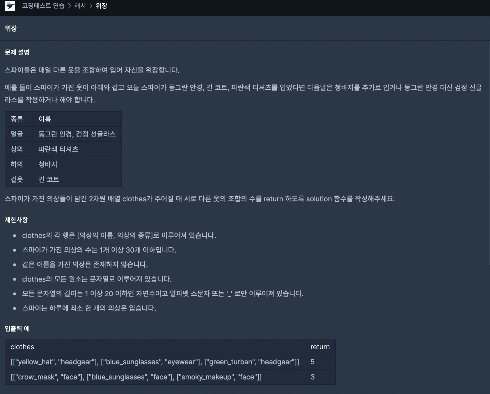 1. clothes 배열을 돌면서 해당 카테고리의 unordered_map (해시 테이블) 수를 증가시킨다.