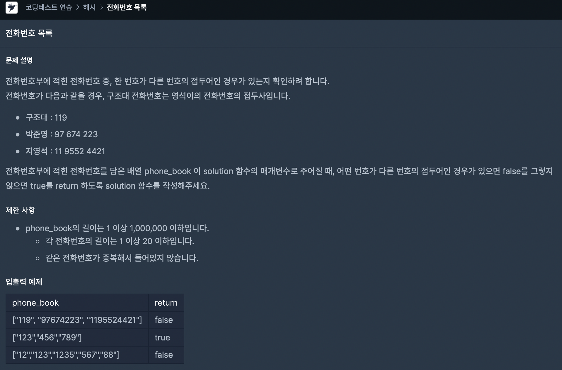 2. phone_book 배열을 돌면서 앞에서부터 만들 수 있는 가능한 접두어에 대해 해당 번호가 존재하는지 확인한다.