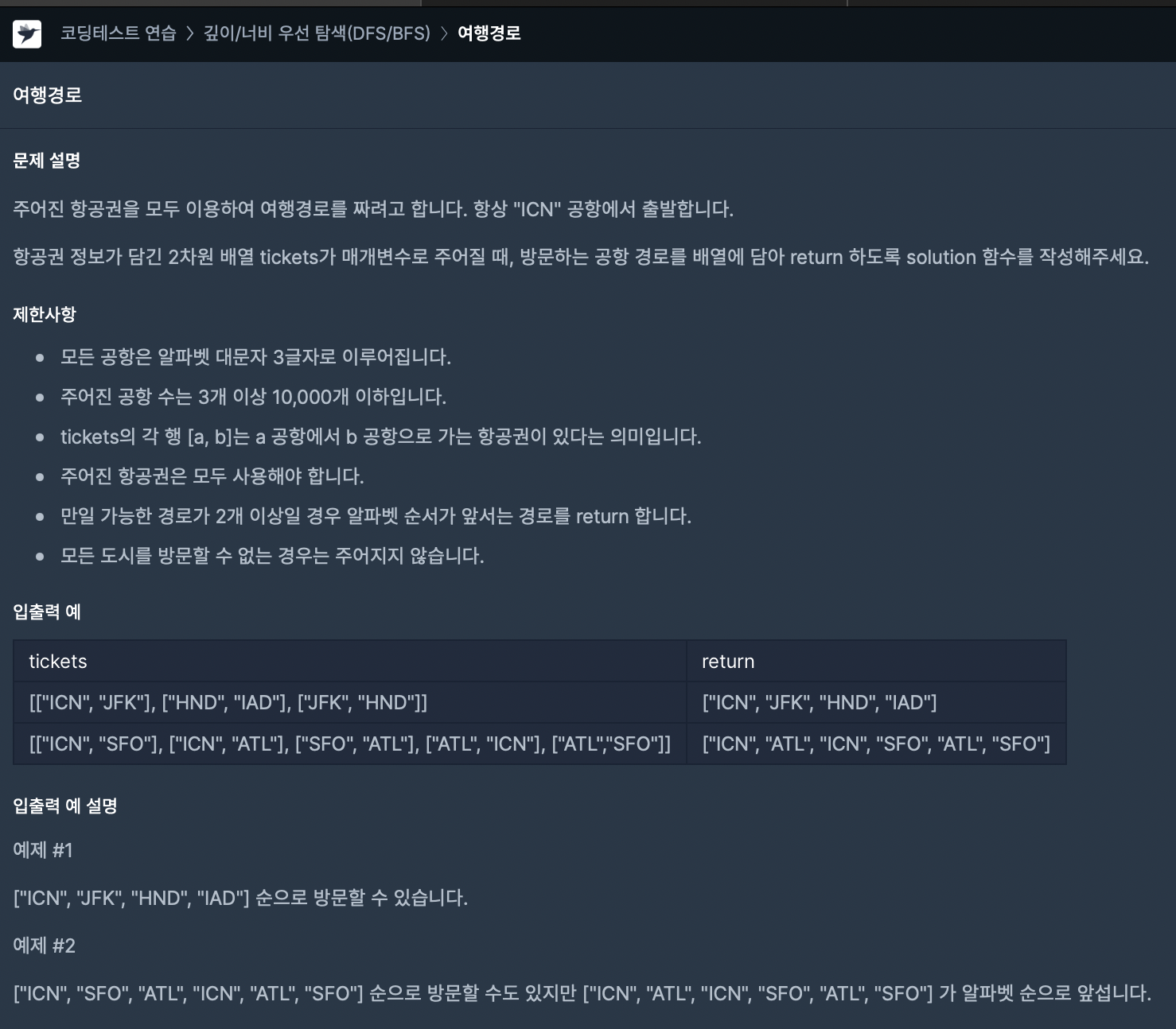 따라서 현재 도시에서 갈 수 있는 모든 경우의 수를 살펴보면서 결과 배열 사이즈가 티켓배열+1 이 될 때가 정답이 되도록 구현하면 된다