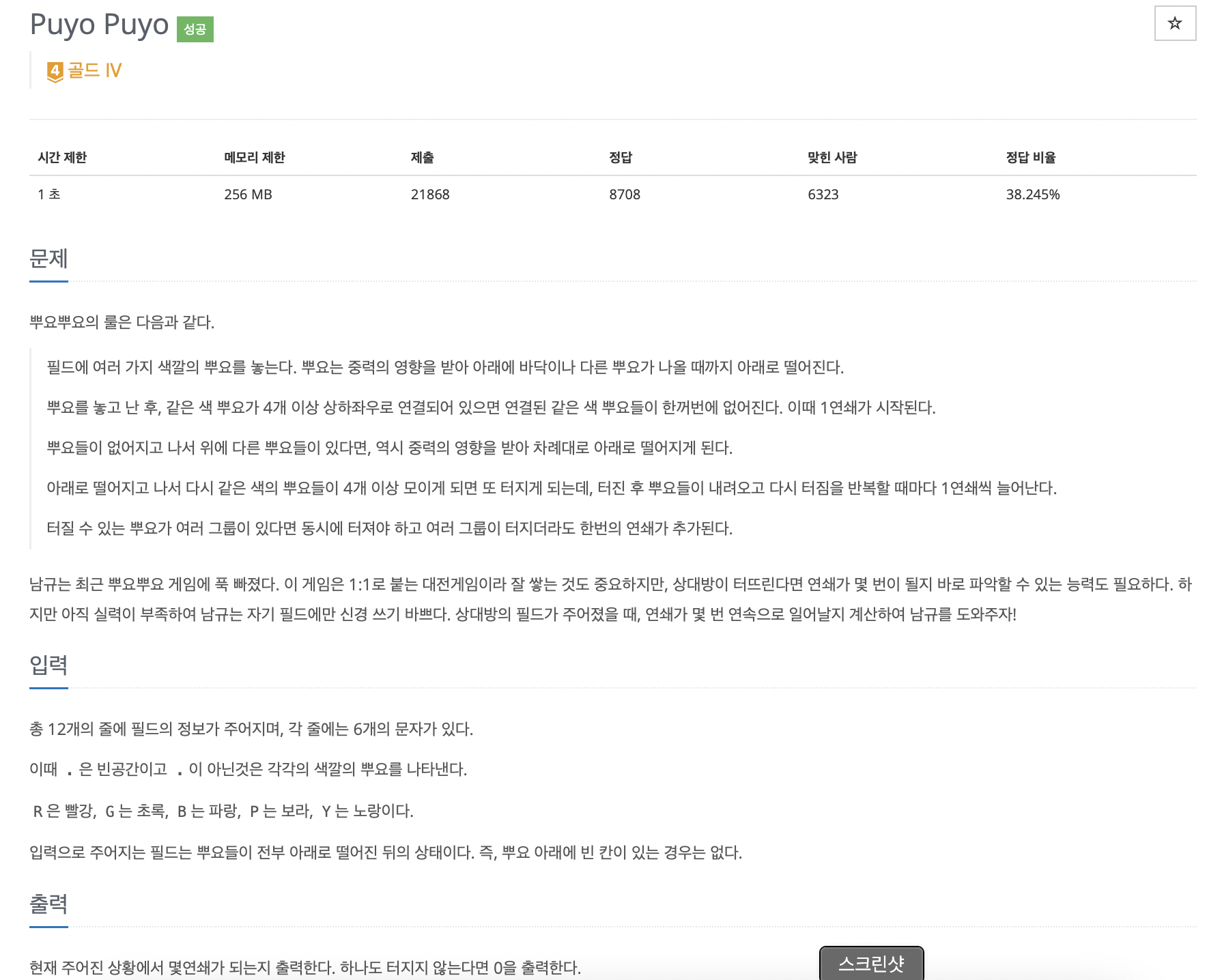 만약 가장 밑에 있는 뿌요가 없어져야 한다면 위에서부터 한칸씩 내려오면서 값을 덮어씌우고 마지막에 맨 첫 줄의 뿌요 값을 . 으로 교체해주면 된다.