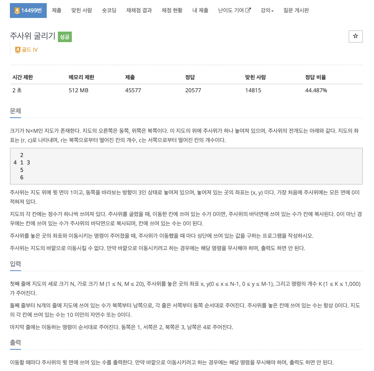 크게 어렵지 않게 풀 수 있으나 주사위 회전에 대해 감을 못 잡는다면 삽질할 수도 있을만한 문제인듯하다.