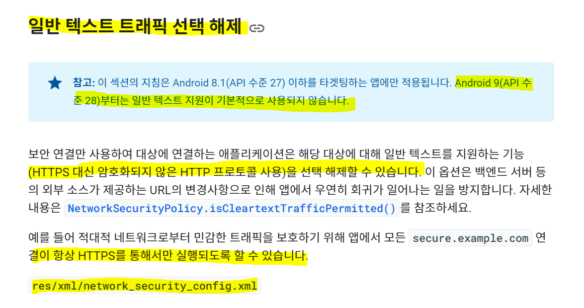 안드로이드 9 (PIE) 부터는 HTTP 트래픽을 차단하고 HTTPS만 허용하도록 정책이 바뀜