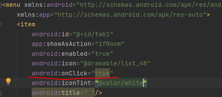 결론: menu 리소스에는 onClick 속성에 true, false가 아니라 실행될 메서드 명을 써야함