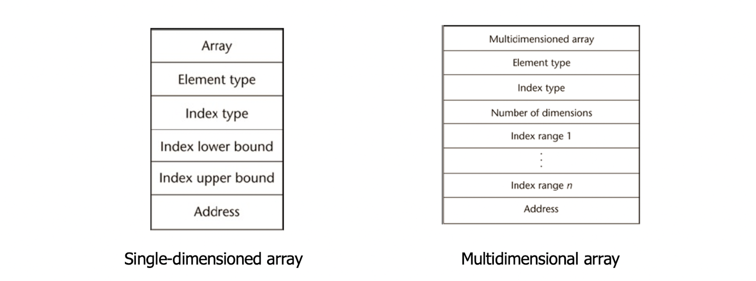c에서 array라는 data type은 compile time descriptor를 가진다. 그래놓고 run time에는 이를 버려서 run time descriptor를 유지하지 않는다. 그냥 symbol table 이라고 생각하면 된다.