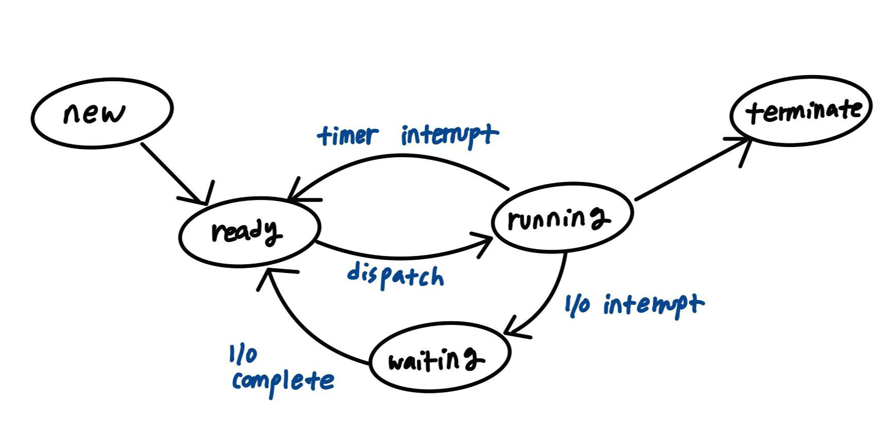 - waiting: Waiting for same event to occur. 프로세스가 잘 실행되다가 멈춘상태이다. 예를 들면 i/o interrupt와 같은 event가 발생했을 경우에는 process가 cpu자원을 사용하지 않고 waiting 상태로 물러난다.