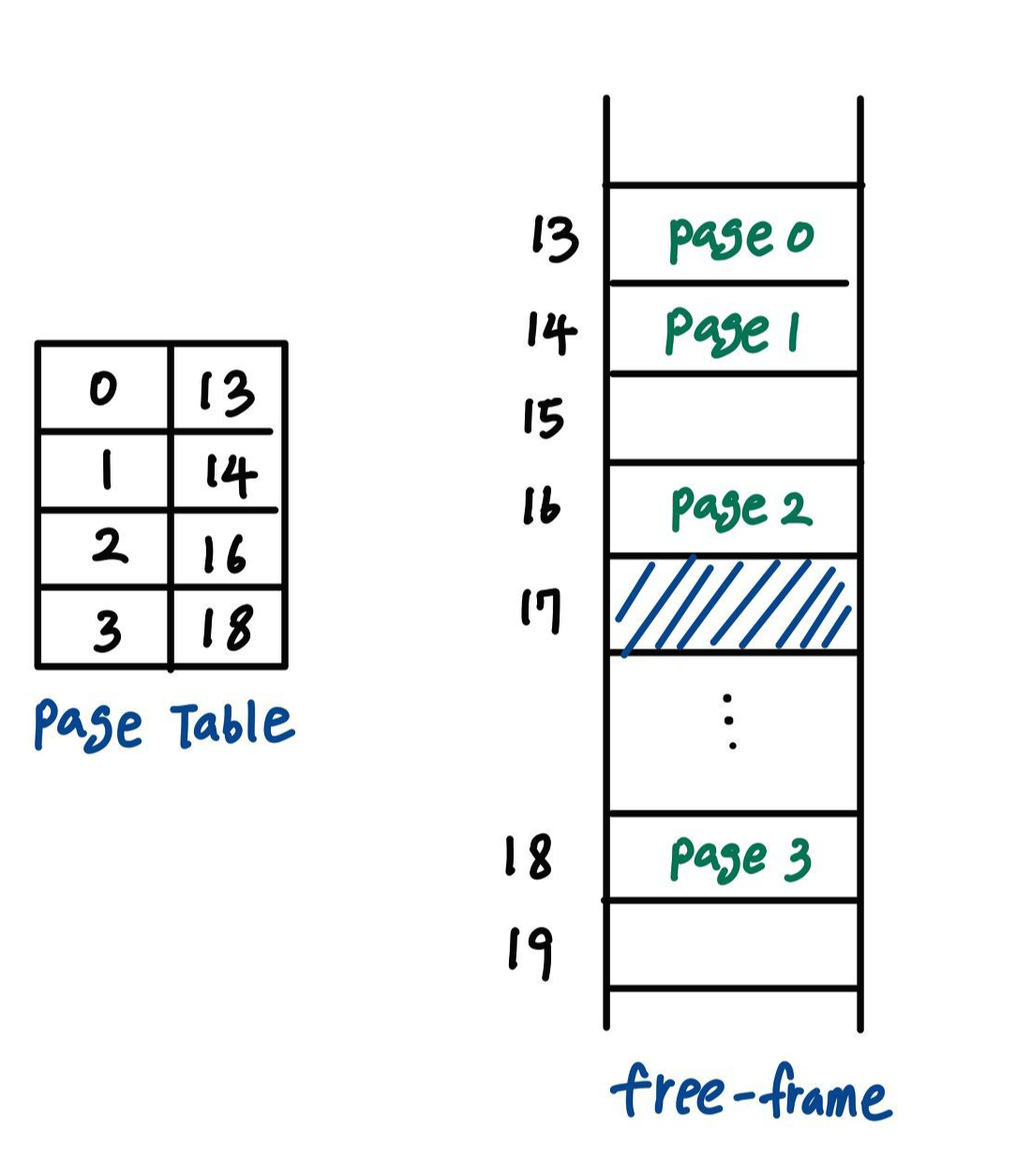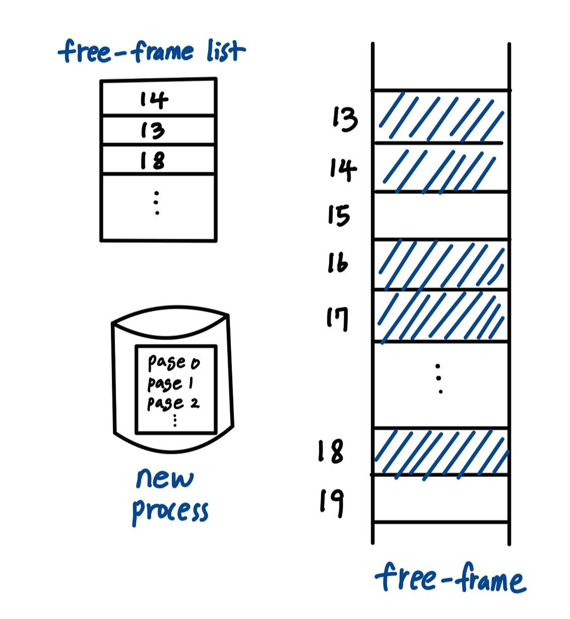왼쪽과 같이 process가 가진 page를 free frame의 정보를 모아둔 리스트와 연결하여 이전 그림과 같이 변환을 하여 page table을 구성한다.