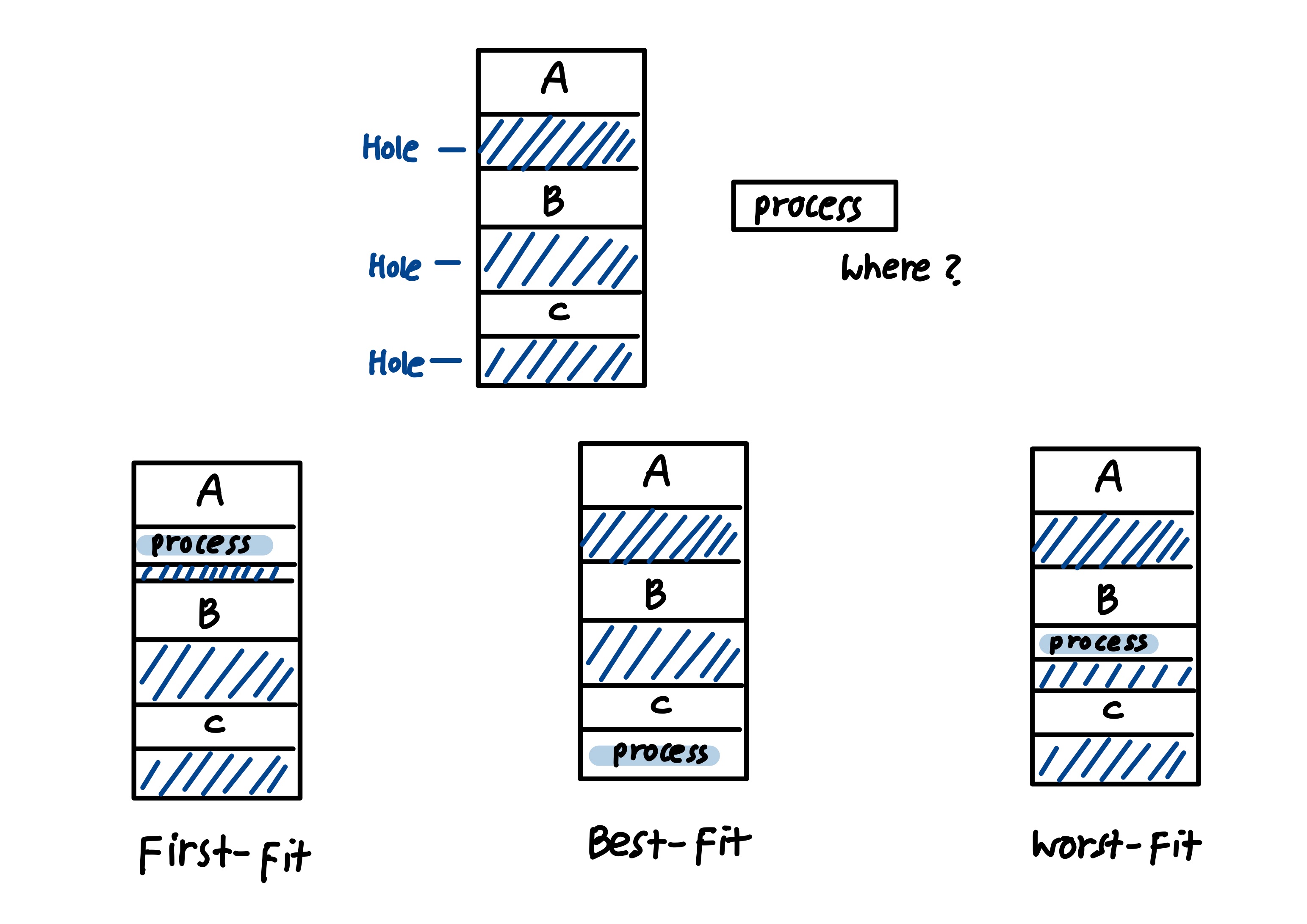 memory management에서 핵심은 메모리를 어떻게 효율적으로 사용하느냐 이다. 따라서 메모리에 데이터를 올릴 때 어떻게 최대한 남는 공간 없이 활용할 수 있을까? 가 핵심 이슈이다.