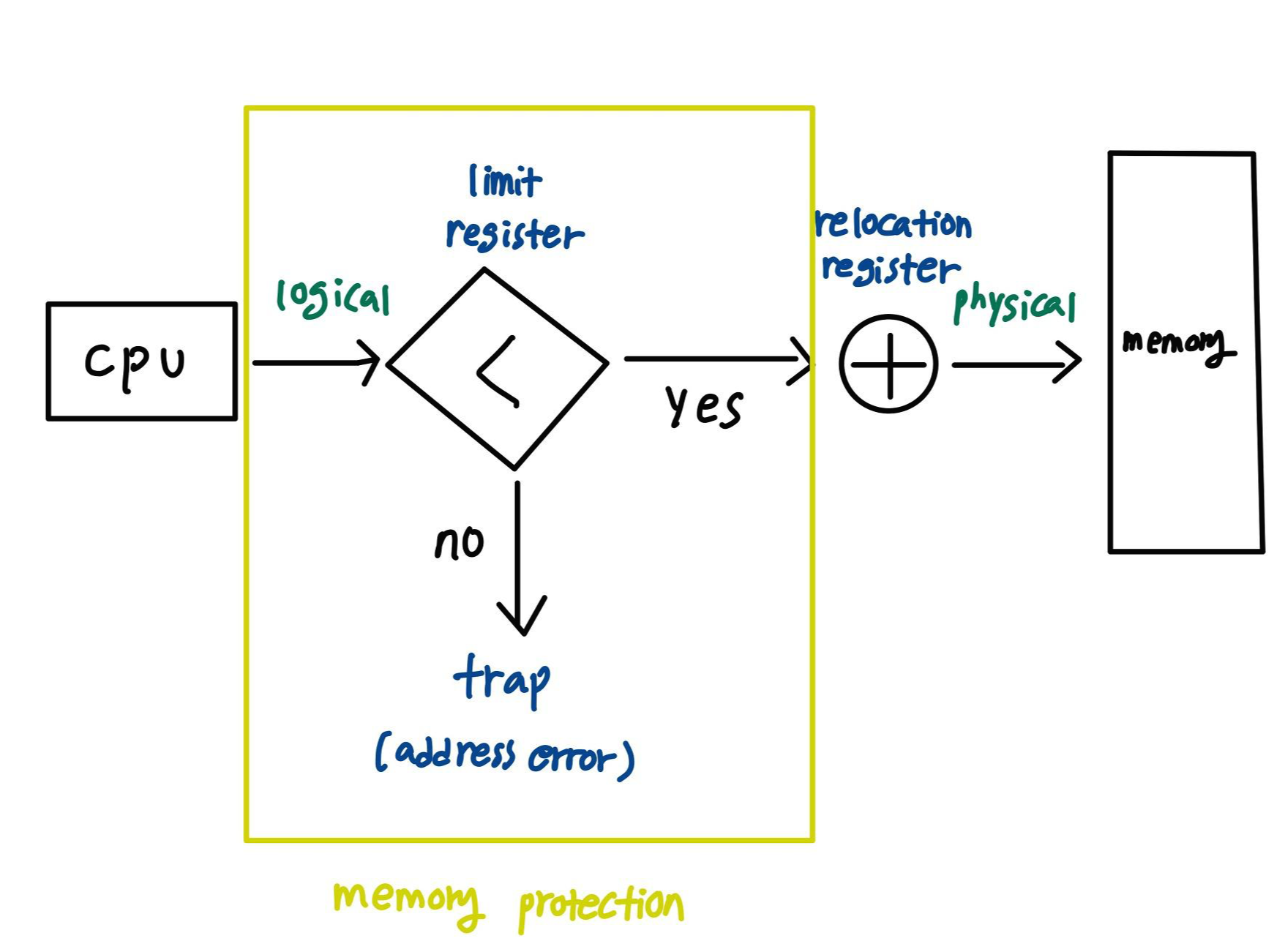: logical address의 범위이다. (logical < limit)이 성립해야 배치할 수 있다. 이 또한 memory protection의 기법이다.