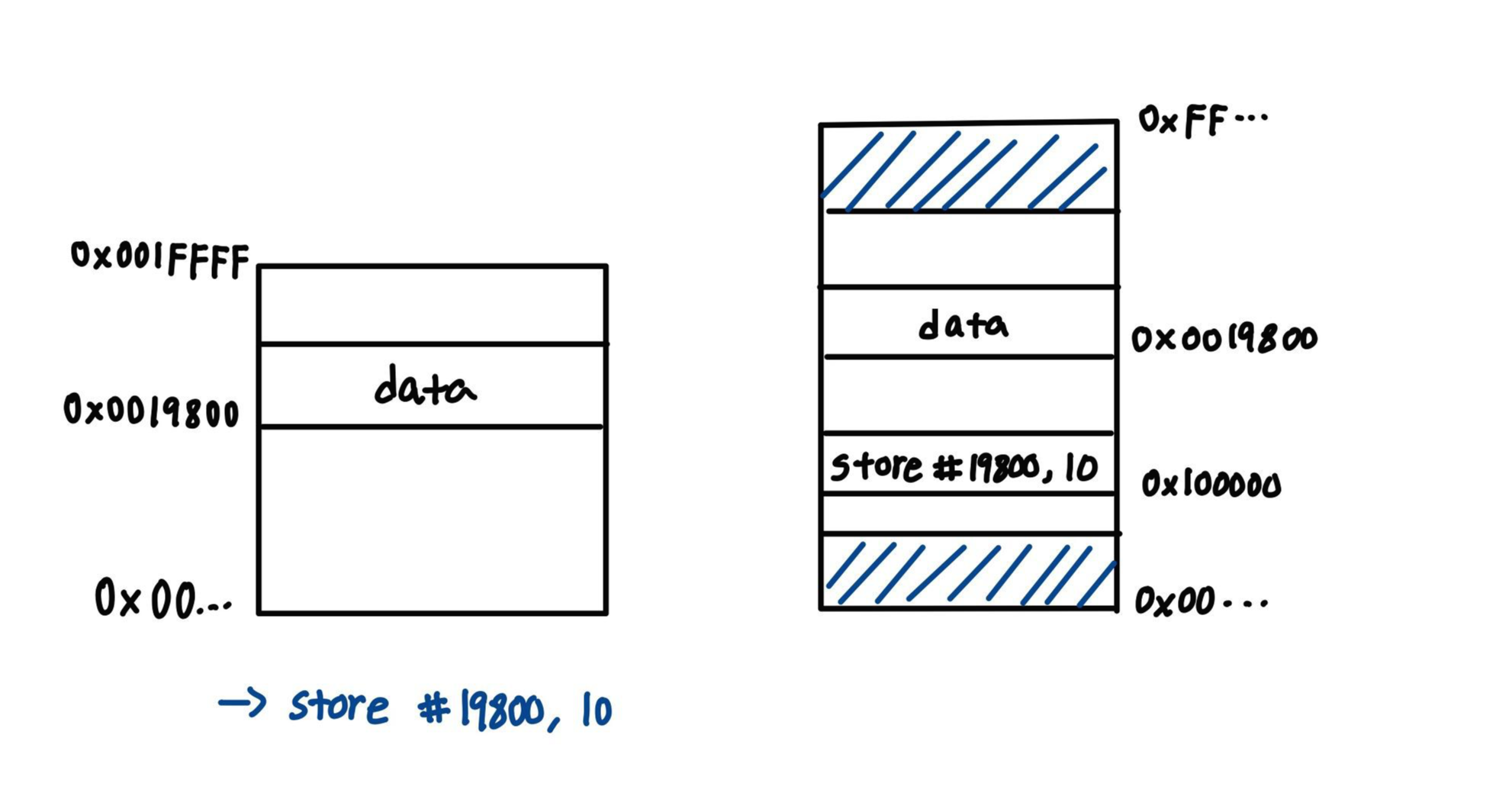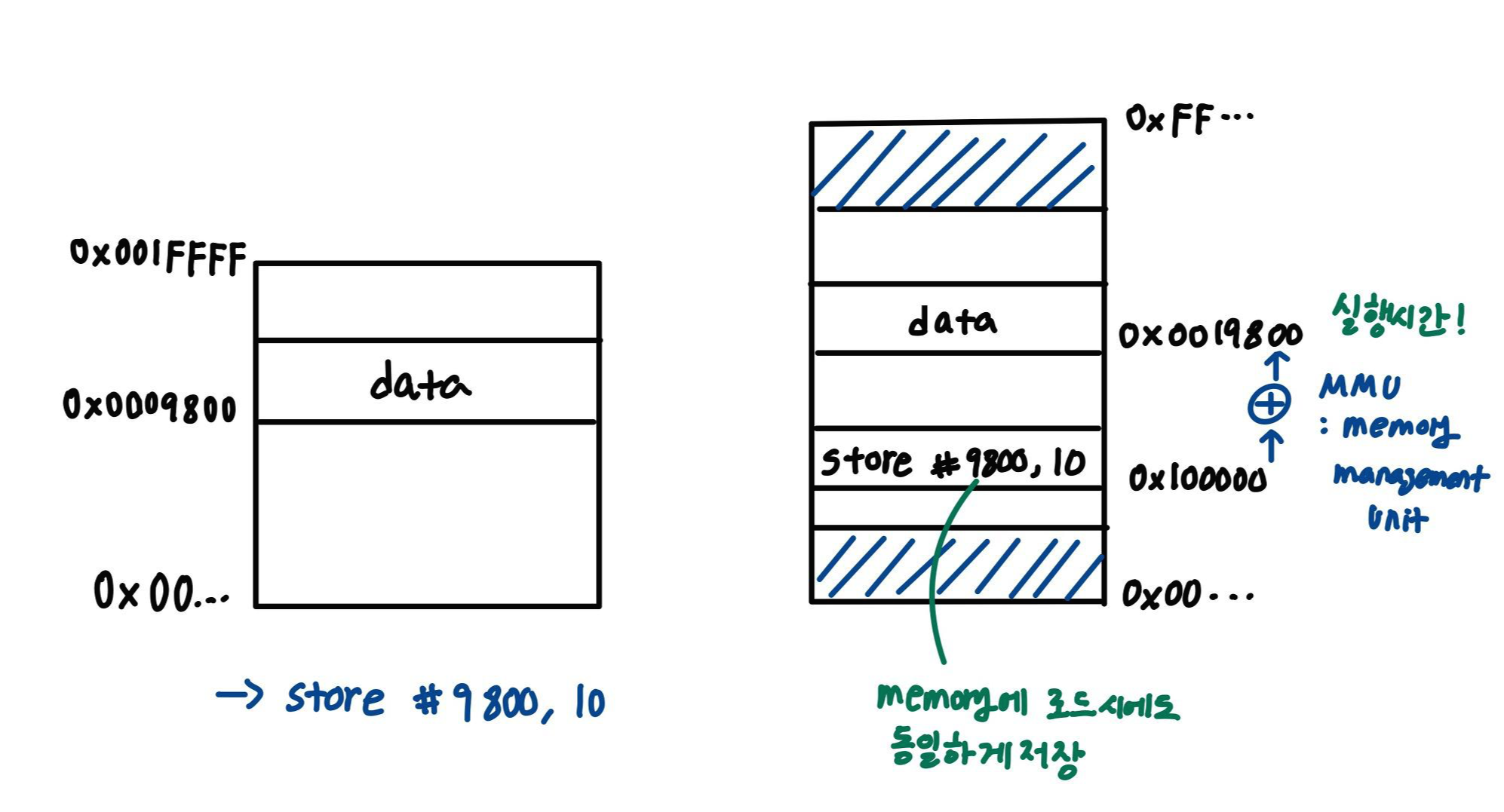 즉 compile time에 저장된 주소가 실제 메모리 공간에서의 주소와는 다르게 저장된다.