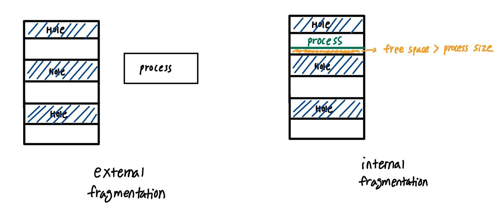 : total memory는 충분함에도 불구하고 연속되지 않아 Process를 allocate 할 수 없는 상황