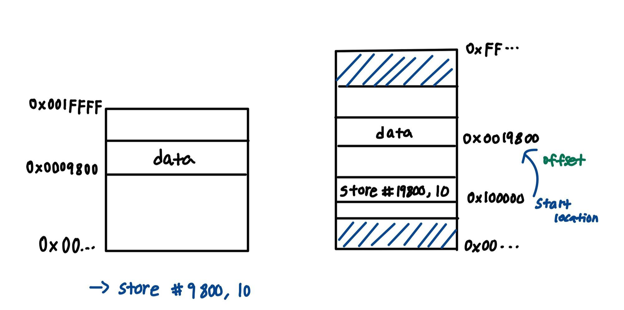 : 메모리에 로드할 때에도 compile시 저장했던 주소와 동일하게 저장하고, 실행할 때 시작주소에서 더해서 저장한다.