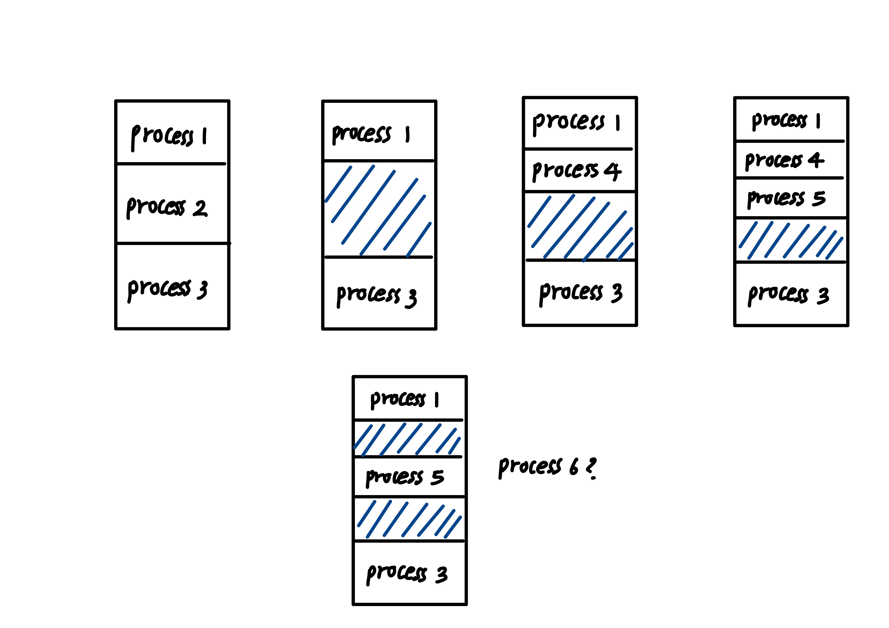 이 경우 process4가 종료되어 free partition(=hole)이 두 군데나 생겼지만 모두 process 6보다 크기가 작아 배치가 불가능한 상황이 생긴다. 이를 외부 단편화라고 하는데 하여튼 이러한 경우가 생기기 쉽다.
