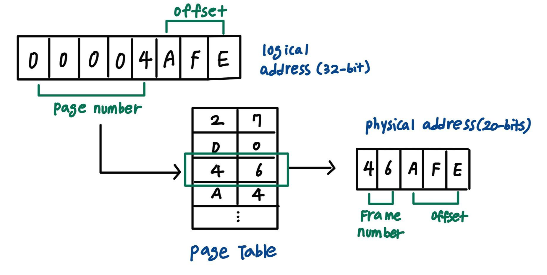 그렇다면 메모리가 불연속적이기 때문에 어떤 page가 어느 위치에 있는지 어떻게 알 수 있을까? 즉, logical address 에서 physical address 로의 변환은 어떻게 이루어질까?