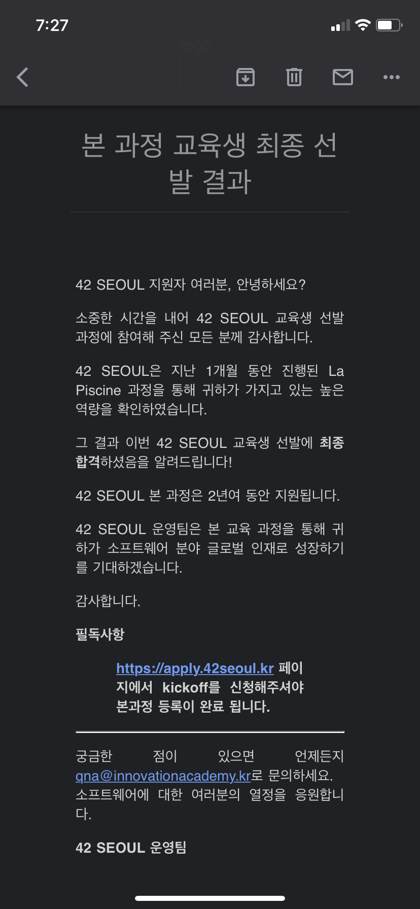 본과정에 합격했다는 메일을 받게 되었고, 6기는 내가 했던 1차 때 시험 서버가 터진 관계로 1기 2기를 분리선발 하였다고 알려주었다.