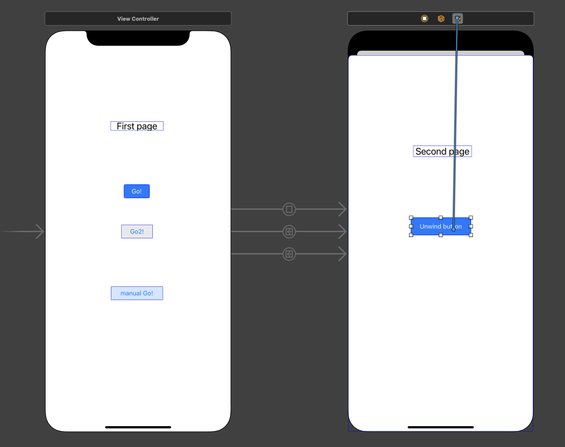 segue가 일방통행이므로 wind segue 하나, unwind segue 하나 총 두개 만들어서 서로를 연결하면 될까?