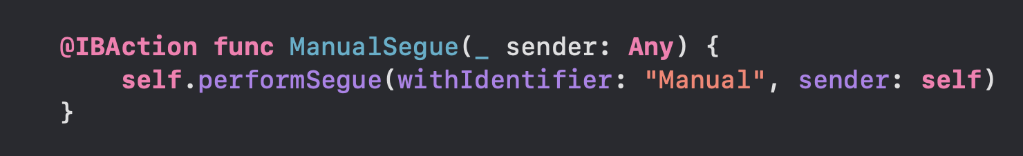 이 안에 다음과 같이 메소드를 사용하면 manual segue 설정이 완료된다.