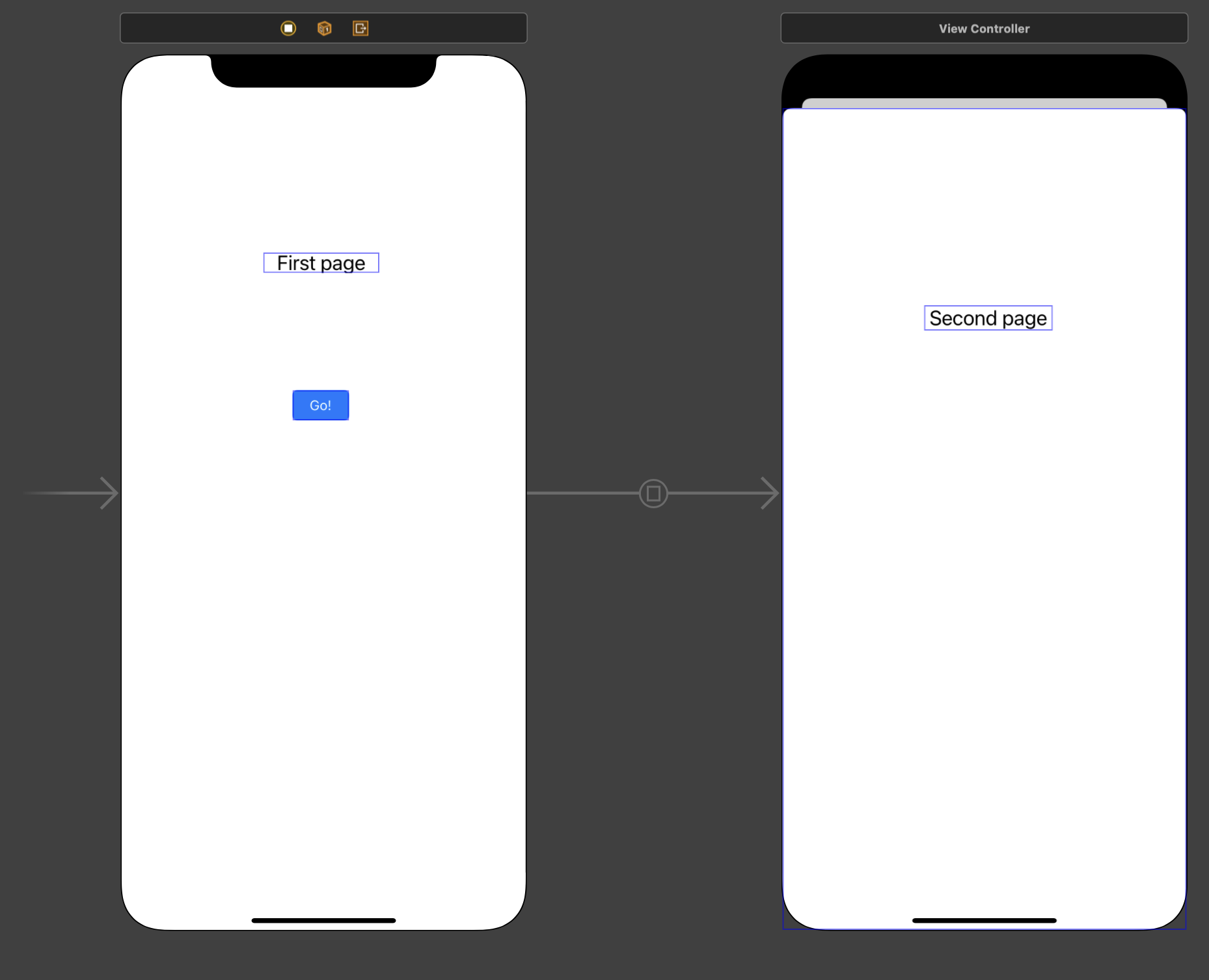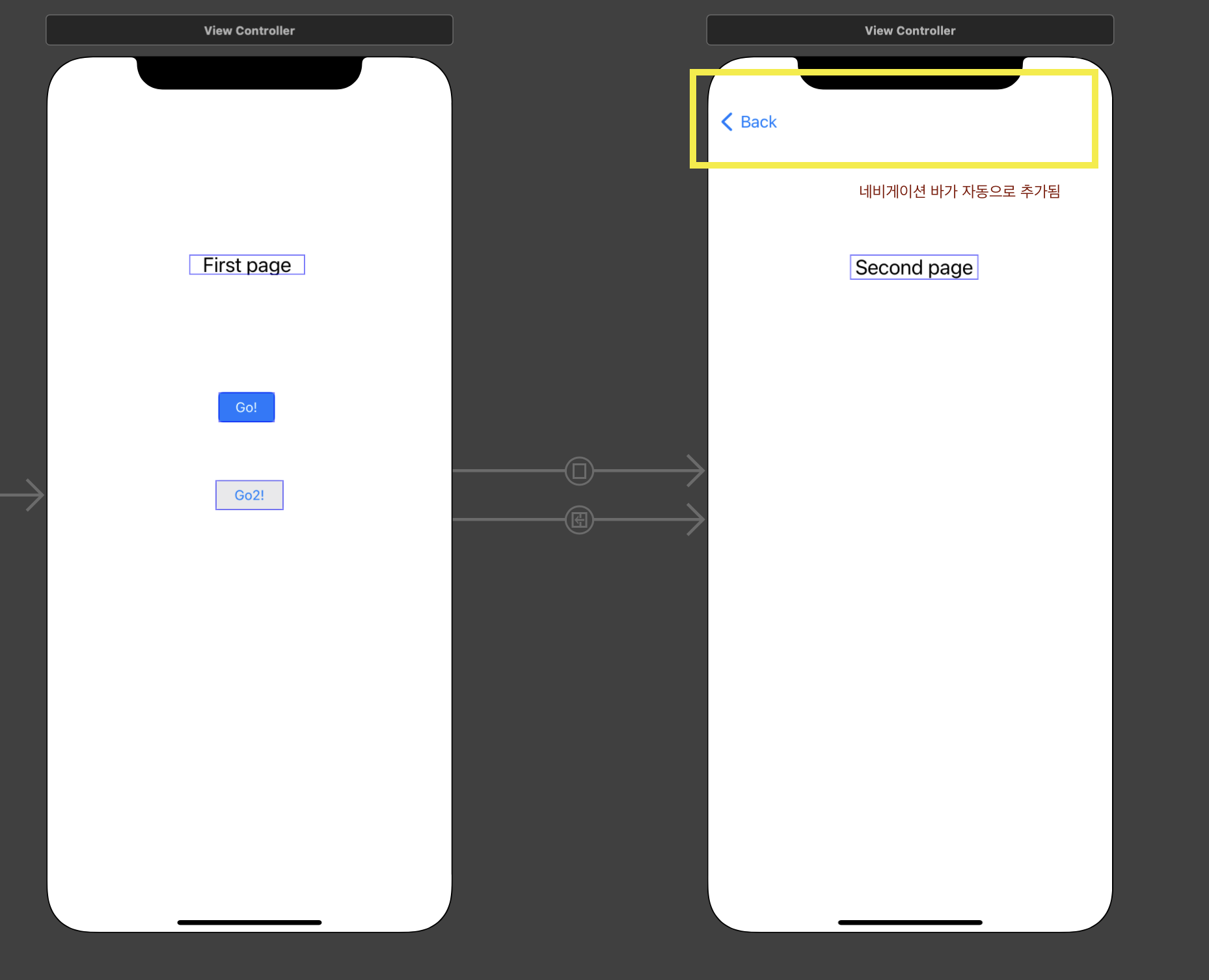 navigation controller를 추가하고 Go2! 버튼은 [show] 방식으로 연결하면 다음과 같다.