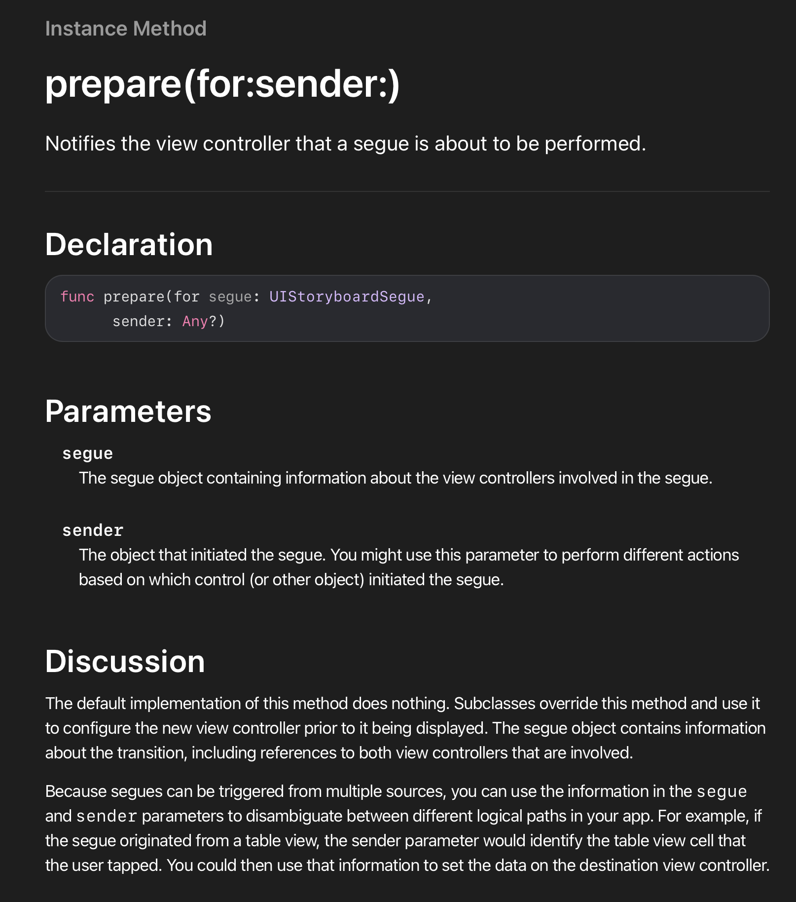 예를 들면 action segue라면 어떤 button 또는 table cell인지에 대한 정보를 가지고 있고, manual segue라면 뷰 컨트롤러가 전달된다.