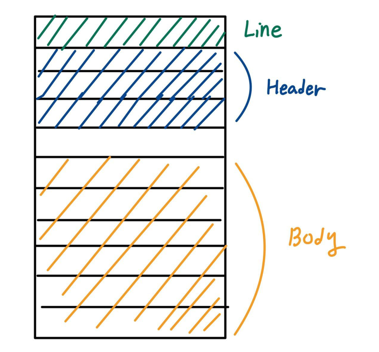 Line은 메세지의 가장 기본적인 내용이 담긴다. 예를 들어, 응답 or 요청인지 구분 여부, 메세지 전송 방식, 상태 정보 등이다.
