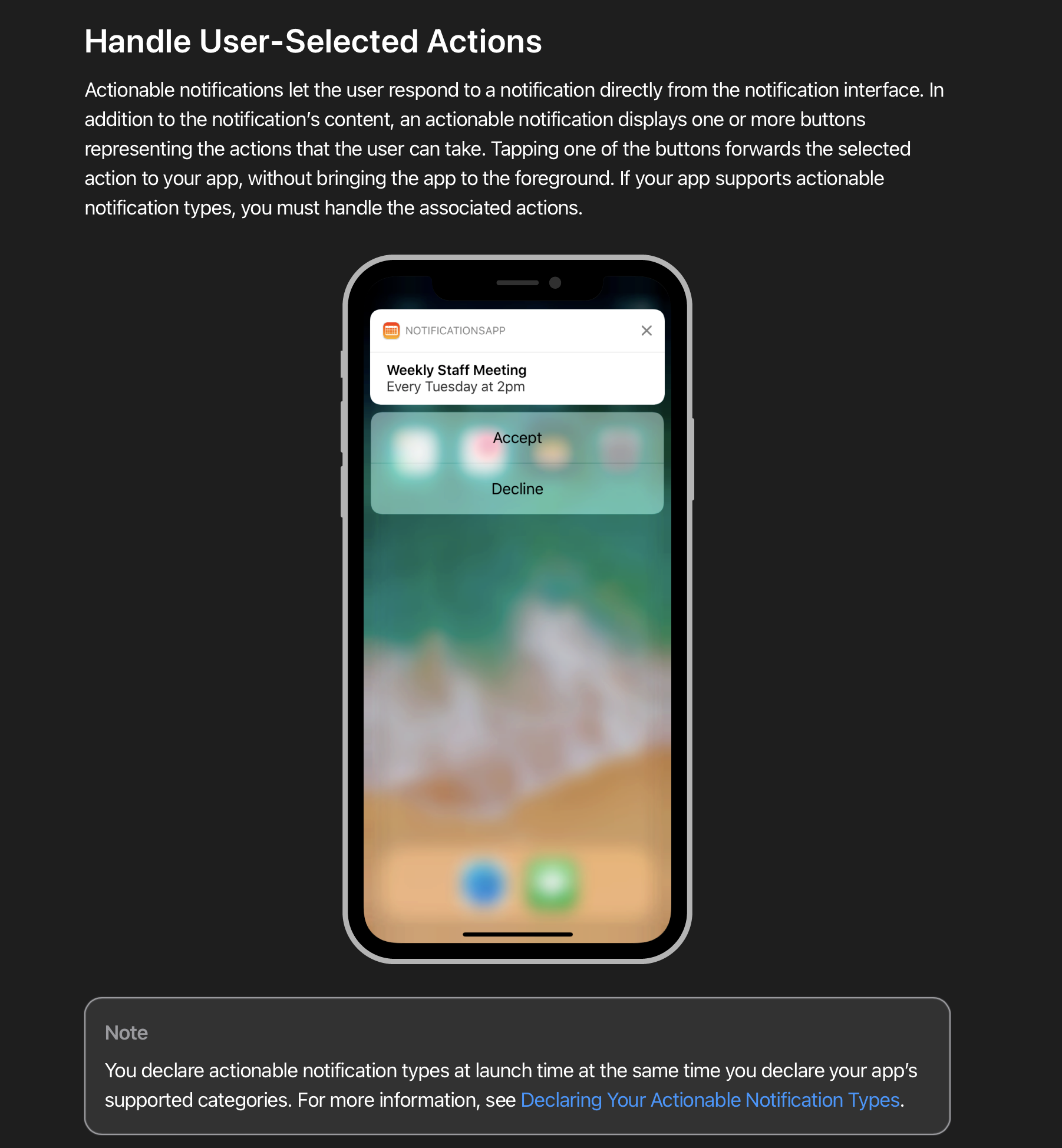 이러한 사용자 액션은 델리게이트 패턴을 이용하며, UNUserNotificationCenterDelegate 을 구현함으로써 만들 수 있다.