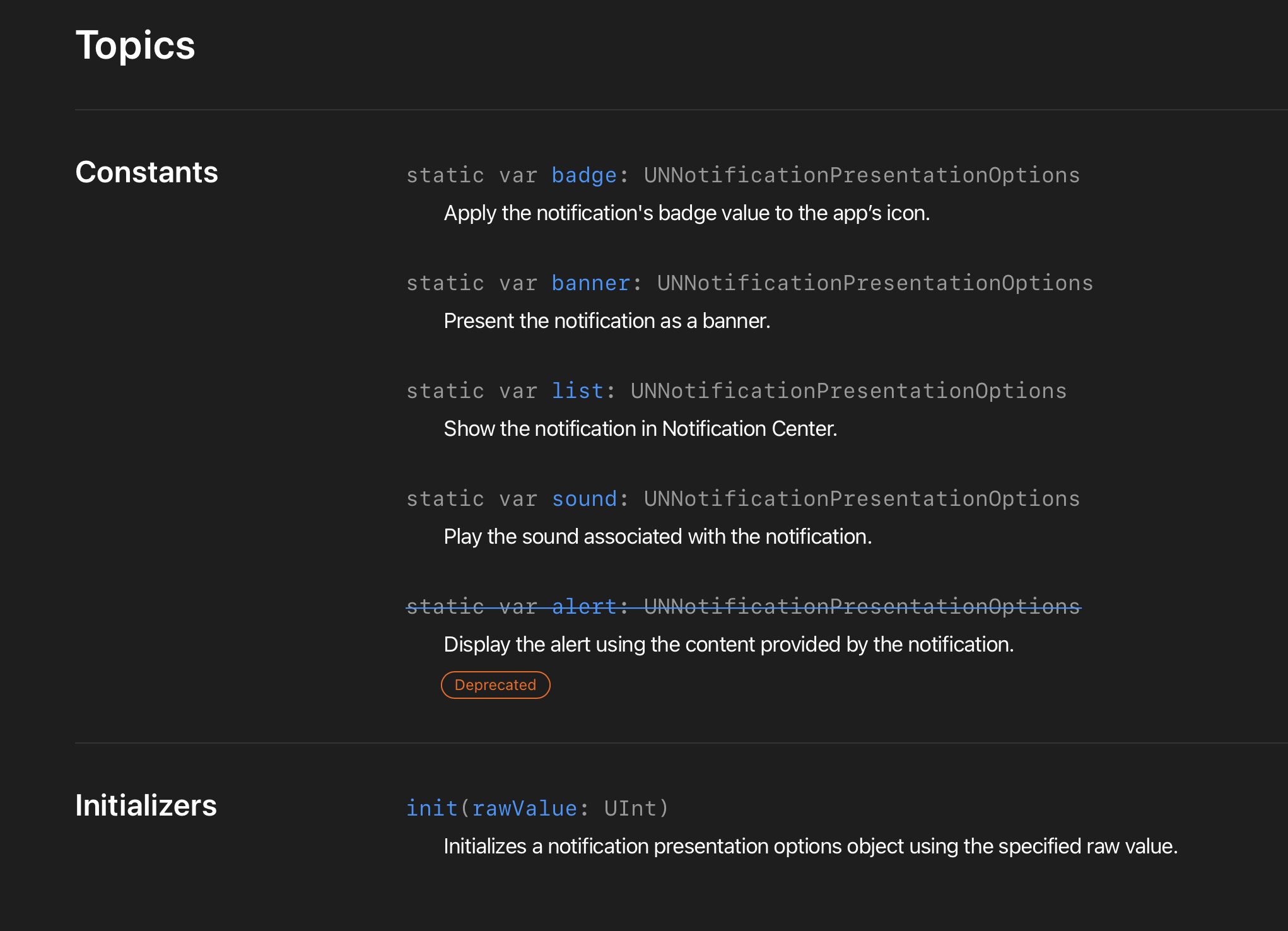사용자에게 알람을 보낼때 사용하는 option이다. UNNotificationPresentationOptions 구조체에 정의되어 있다.