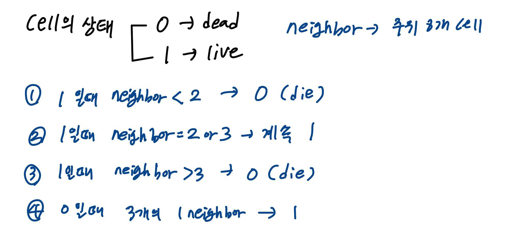 2차원 vector를 돌면서 이웃한 cell 중에서 몇개의 1이 있는지 확인한 후, 값을 정한다.