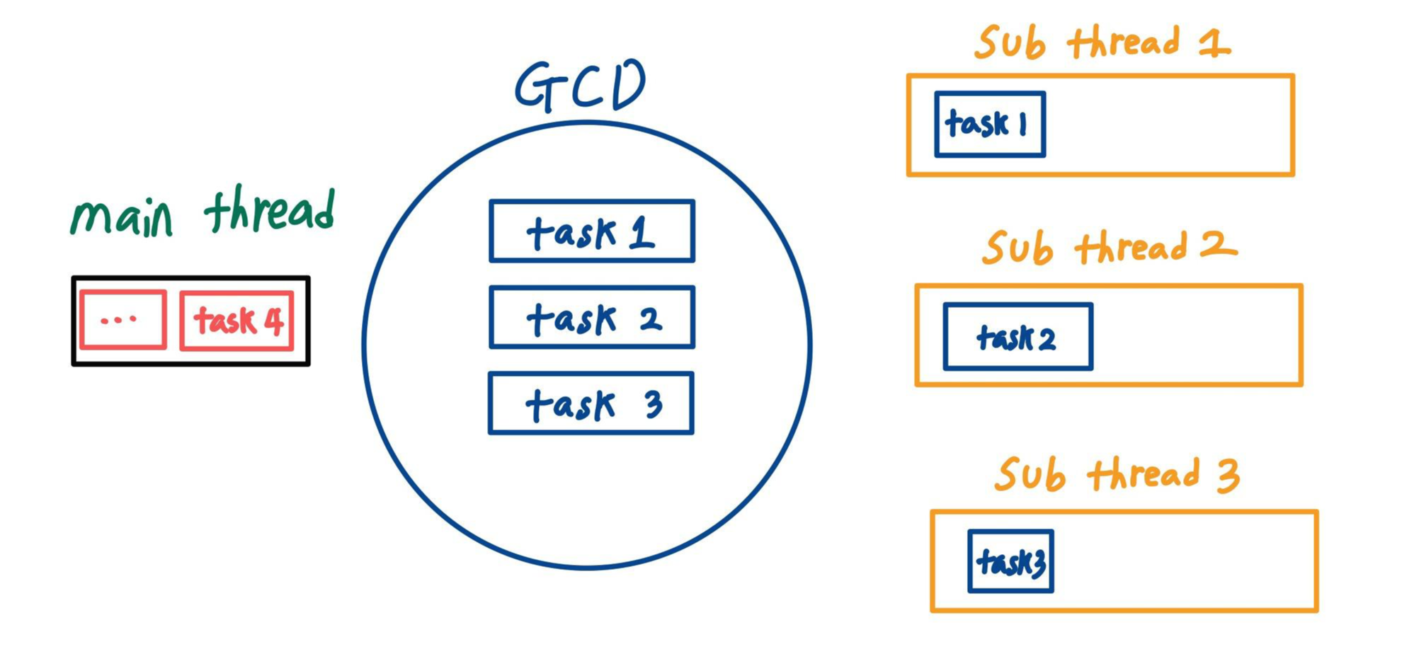 즉 개발자가 멀티 스레딩을 할 작업을 그저 GCD에게 보내서 "나 멀티 스레딩 하고 싶은데?" 라는 의지만 보여주면, GCD는