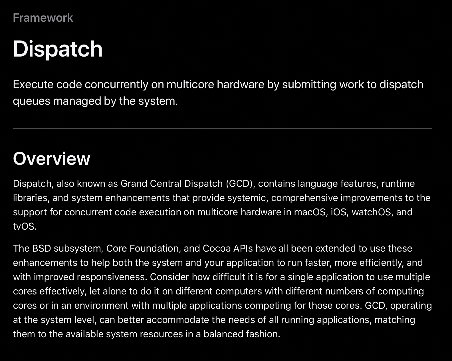 GCD(Grand Central Dispatch)라고도 하는 Dispatch에는 macOS, iOS, watchOS 및 tvOS의 멀티코어 하드웨어에서 동시 코드 실행 지원에 대한 체계적이고 포괄적인 개선 사항을 제공하는 언어 기능, 런타임 라이브러리 및 시스템 개선 사항이 포함되어 있습니다.